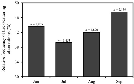 Dry season monthly variations in the relative frequency of pixels selected to compose the MOD13A2 product at the backscattering direction (RAA > 90°). Comparatively, more BRDF hotspot observations (n) are registered from the beginning (June) to the end (September) of the dry season. Results refer to 2008 and 4500 pixels distributed over the entire Amazon region.