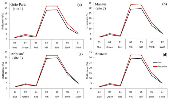 Monthly average surface reflectance (2000–2014) of dense ombrophilous forest for MODIS (MAIAC) data non–corrected for bidirectional effects. Spectra are shown for the beginning (June) and end (September) of the dry season over (a) site 1, (b) site 2, (c) site 3, and (d) the entire Amazon region (n = 4500 sampled pixels). The number of pixels per site was 100. Precise MODIS band positioning is indicated in the text.