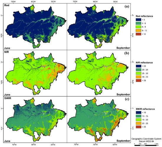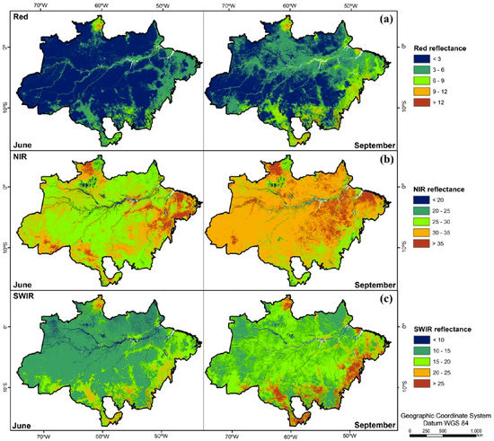 Variations in monthly average surface reflectance (2000–2014) for MODIS (MAIAC) data non–corrected for BRDF effects in bands (a) 1 (red), (b) 2 (near infrared—NIR), and (c) 6 (shortwave infrared—SWIR). For all bands, a reflectance increase is observed from the beginning (June) to the end (September) of the Amazonian dry season.