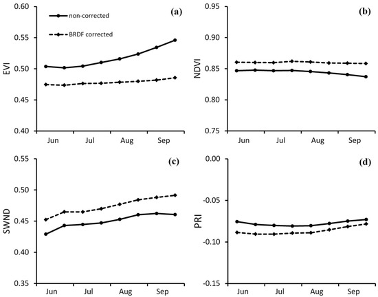 Comparison of monthly average profiles (2000–2014), before and after the BRDF correction, showed distinct patterns of VI anisotropy during the dry season (Figure 8). For instance, the EVI (Figure 8a) and PRI (Figure 8d) decreased with BRDF correction, while the NDVI (Figure 8b) and SWND (Figure 8c) increased after this viewing–illumination normalization. The EVI increase observed from June to September was greatly reduced after the correction of bidirectional effects. From the inspection of the profiles, the most anisotropic VIs with BRDF effects were the EVI, PRI, and SWND. The least anisotropic VI was the NDWI (results not shown). Compared to the non–corrected data for bidirectional effects, the most significant changes in the shape of the curves after correction was observed for the EVI (Figure 8a), especially at the end of the dry season due to increasing MODIS hotspot observations (RAA close to 180°). For BRDF–corrected VIs, the small differences observed between June and September for the EVI (approximately 0.02) were followed by small increases in other VIs toward the end of the dry season. This is the case of the PRI (photosynthetic activity) (Figure 8d) and SWND (vegetation moisture) (Figure 8c), and the GRND (leaf flushing) and NDWI (canopy/leaf water) (results not shown).