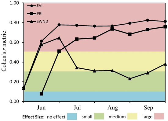 Variations in Cohen’s r metric of effect size (absolute values) at site 2 (Manaus), derived from the non–parametric Mann–Whitney U test. The magnitude of the BRDF effects is indicated for the enhanced vegetation index (EVI), photochemical reflectance index (PRI), and shortwave infrared normalized difference (SWND). The limits of the effect size are based on Cohen [32].