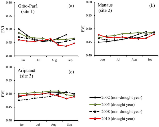 Variations in average BRDF–corrected enhanced vegetation index (EVI) (n = 100 pixels per site), as a function of the drought (2005 and 2010) and non–drought (2002 and 2008) years, for the sites (a) Grão–Pará, (b) Manaus, and (c) Aripuanã.