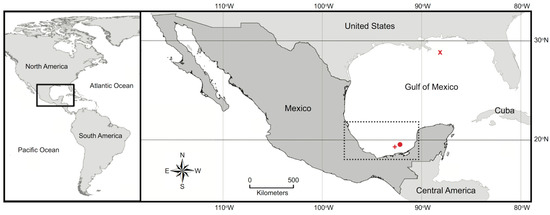 The oil and gas industry has had deleterious ecological impacts on the waters of the Gulf of Mexico, which has experienced two very large offshore spillage episodes releasing tons of crude petroleum in this tropical marine environment (Figure 1): the Ixtoc-1 discharge off the Mexican coast in 1979 [1,2,3,4,5,6], and the Deepwater Horizon event off the U.S. coast in 2010 [7,8,9]. These two accidents are recognized as the largest peacetime oil-related environmental incidents [10,11,12]. The Gulf also contains a large number of oil seepage sites [13,14,15,16]. Among these, is the world’s largest active natural oil leak at the sea floor, the Cantarell Oil Seep [17,18] in Campeche Bay (Figure 1).