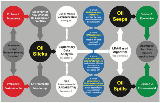 Research rationale of our exploratory data analysis aimed to try to improve the slick category discrimination (seeps vs. spills) using linear discriminant analysis (LDA) applied to synthetic aperture radar (SAR) measurements. Circles’ colors: gray, red, and green (bridge the knowledge of our academic ocean remote sensing strategy and operational applications of the offshore petroleum industry); black (our main objective: categorize slicks into seeps or spills); white (our exploratory data analysis: site-, data-, and algorithm-specific); and blue (our four scientific questions). SAR backscatter coefficient: sigma–naught (σ°), beta–naught (β°), and gamma–naught (γ°). SAR calibrated product: reflected radar beam given in amplitude (amp) or in decibel (dB), with or without a despeckle filter. Data transformations: none, cube root, and log10. Oil-slicks’ signature: size information and SAR basic qualitative-quantitative statistics.