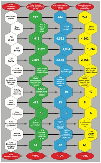 Collectively, these publications bring together our earlier investigations, having in common an overall accuracy of ~70% in discriminating the slick category. The current research is the second attempt at trying to improve the seep–spill discrimination, leading us to perform a more rigorous, detail-oriented approach.