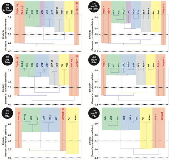 Unweighted pair group method with arithmetic mean (UPGMA) dendrogram analyses for sigma–naught (σ°) given in amplitude (amp), without (left) and with (right) a despeckle filter (FF; for Frost filter [62]), for the tested non-linear transformations: none (top), cube root (middle), and log10 (bottom). Dotted lines: strict similarity phenon thresholds (r = 0.3 and −0.3). Yellow and red: size information (basic morphological characteristics and their ratios, respectively). Green and blue: SAR basic qualitative-quantitative statistics (central tendencies and dispersion, respectively). Gray: pixel distribution metrics. Uncorrelated variables (+) selected in our current research; see also Table 4. The (@) indicates those explored in the first refined study (amp instances only [31,32]). For an explanation of the attributes, see Section 3.1.