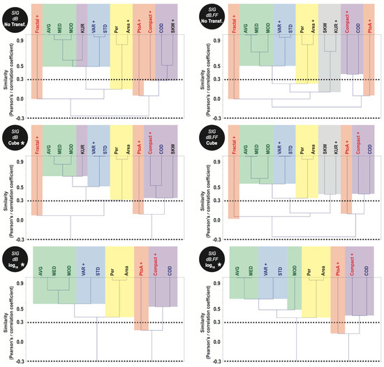 Unweighted pair group method with arithmetic mean (UPGMA) dendrogram analyses for sigma–naught (σ°) given in decibel (dB), without (left) and with (right) a despeckle filter (FF; for Frost filter [62]), for the tested non-linear transformations: none (top), cube root (middle), and log10 (bottom). Dotted lines: strict similarity phenon thresholds (r = 0.3 and −0.3). Yellow and red: size information (basic morphological characteristics and their ratios, respectively). Green and blue: SAR basic qualitative-quantitative statistics (central tendencies and dispersion, respectively). Gray: pixel distribution metrics. Purple: undefined group. Uncorrelated variables (+) selected in our current research; see also Table 4. The (*) indicates the requirement of a second round of dendrogram analysis; see Section 3.2. For an explanation of the attributes, see Section 3.1.