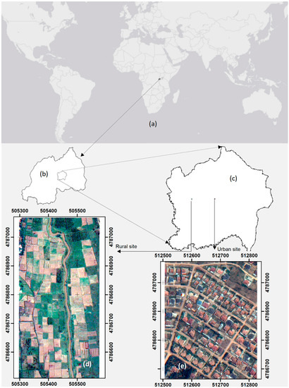Case study location: (a–e) show, respectively, the study area on global scale; Rwanda; the city of Kigali; the rural site and urban site. Coordinates system is ITRF2005.