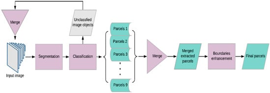 In the rural area, parcel automation involved three main operations: segmentation, classification and boundary enhancement, and used different techniques such as chessboard and multiresolution segmentation. Due to intra-parcel and inter-parcel variability, segmentation may generate undesired segments [50]. To deal with this issue, an iterative approach of segmentation and subsequent classification was applied, and we created several classes of parcels and then a merged an output containing all parcels.