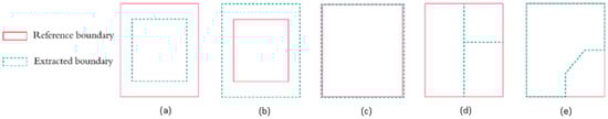 Considering the scenarios elaborated (Figure 3), we can compute geometric errors such as over-segmentation error (), under-segmentation error (), edge error (, fragmentation error or Number-of-Segments Ratio (NSR) and shape error ) that evaluate the degree of mismatching between the reference cadastral object and the corresponding extracted cadastral object on the map as in [60,61] and as follows: