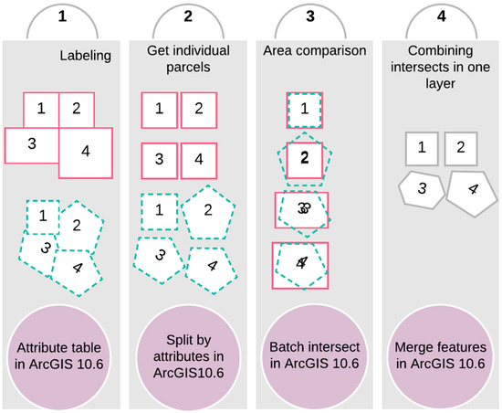 A framework for comparing extracted and reference parcels was developed in the Esri ArcGIS environment (Figure 4). First, we labelled all parcels with unique identifiers. To allow the comparison of each individual parcel in the reference set with the corresponding parcel in the extraction set, the splitting by attributes tool was used to split the index cadastral map into individual parcels. Then the batch intersect tool was used to calculate the intersection for each parcel in the reference data with each corresponding parcel in the extraction set. Resulting intersects were then merged to have one attribute table containing the areas of intersection of extracted parcels and reference parcels. These values were to be fed into Equations (1)–(4). The shape index was computed using the Esri ArcGIS geoprocessing ‘calculate field’ tool.