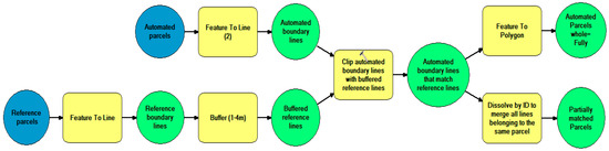 For the edge shifting computation using ArcGIS, a model (Figure 5) was built to automate the process. The edge comparison used the perimeter of parcels. In doing so, we first converted reference and extracted parcels to lines. Then, a buffer, i.e., distance tolerance of 4 m was applied to reference lines, and a clip tool was used to get the length from the total perimeter of extracted parcel, which was correctly extracted to match the reference boundary lines. By clipping automated lines with buffered reference lines, two cases were possible: (1) the extracted parcel fully matched the reference parcel and we could use convert lines to polygon to restore the original extracted polygon and (2) when only few lines belonging to one extracted parcel could match the reference lines. Keeping in mind that in a cadastral map, a line is shared by two parcels, and converting parcels into lines results in a shared line with two different identifiers. To know what portion of the line belongs to which parcel we used dissolve by ID tool.
