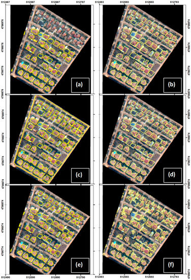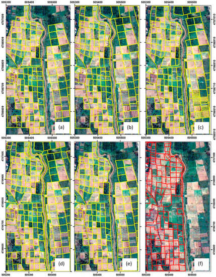 The extraction of parcels and buildings in the urban area relied on visible fences, roofs and roads. Figure 9a–e presents reference parcels (in red) overlaid with manually extracted urban plots (in yellow) and automated parcels in Figure 9f.