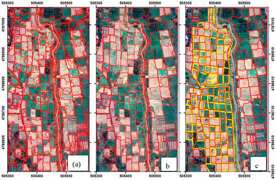 Automatically extracted parcels boundaries: (a) result of the automated Estimation of Scale Parameter (ESP2) tool intact; (b) results of a modified ESP2 and (c) results obtained using expert user-developed rule set. Automated parcels (in red) are overlaid with reference parcels (in yellow).