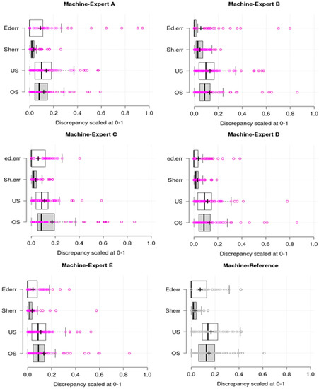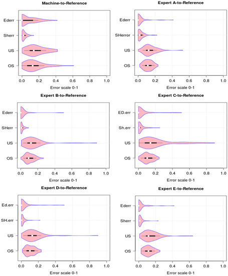 In Figure 11, the wider section of the violin plot [62] indicates higher numbers of extracted parcels within the given error value, whereas the skinnier section shows the reverse case. The graphs allow us to examine the behaviour during all instances, i.e., the variation and likeness in the full distribution and the pattern of responses for machine and human can be visualised and compared.