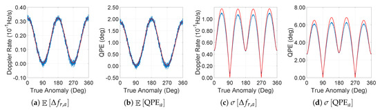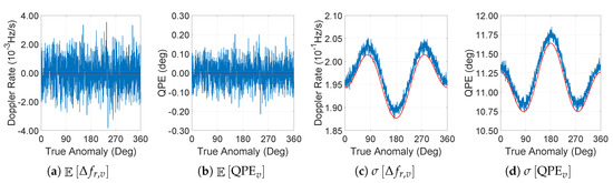 The expected value of the Doppler rate by the acceleration vector term shows different characteristics from those of the velocity vector terms. Figure 4a no longer has an expected value of zero compared with Figure 2a. This non-zero value is due to the calculation of true anomaly from onboard state vector measurements, which also result in a non-zero . In addition, the analytical approximation model fits the numerical simulation result for all .