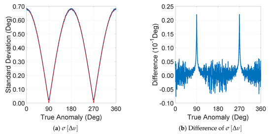 The true anomaly result from measurements between numerical simulation and the analytical approximation model. (a) The analytical approximation model (red) fits the numerical simulation (blue) in most areas of true anomaly. However, at certain true anomalies, which are the unique positions of the satellite in its orbit, the difference between the two sets of results increases. (b) At around and , significant peaks arise for approximately in the standard deviation of .