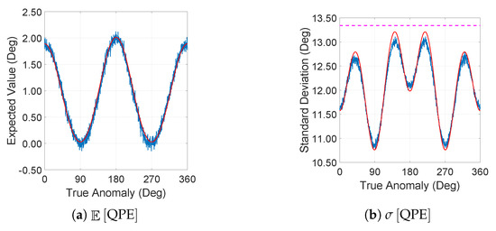 plays an important role in the analytical approximation model of QPE, and Figure 3 presents the results from both the numerical simulation and the analytical approximation model. Figure 3a indicates that the results of the analytical approximation model are almost identical to those of the numerical simulation. However, in the analytical approximation model, at and , reaches zero according to Equation (28), while the numerical simulation result is not zero at that position. In the proposed model, we assume that there are no errors in the term in Equation (27), which leads to a value of zero for when the satellite is positioned at true anomalies and . In fact, at those positions, the errors in the measurements start playing a major role in the calculation. However, at those two specific positions, reaches its minimum, thus it does not introduce much error to the analytical approximation model.