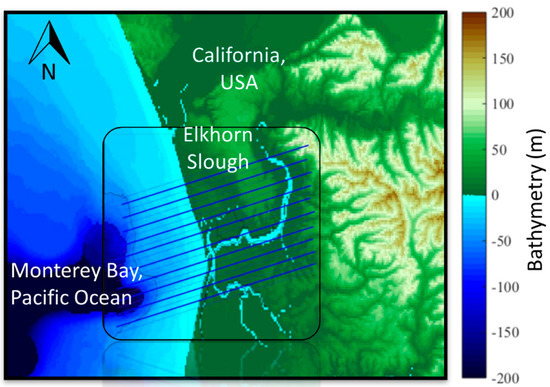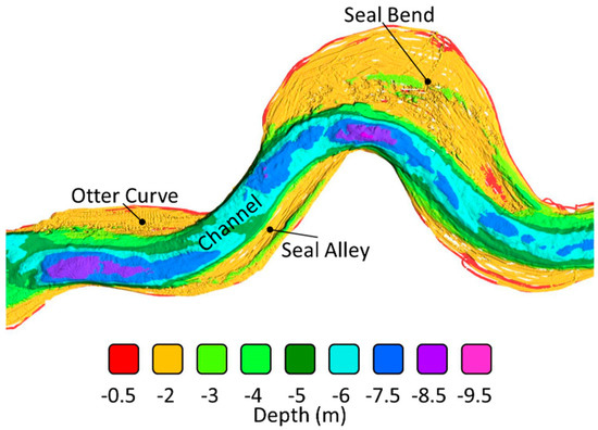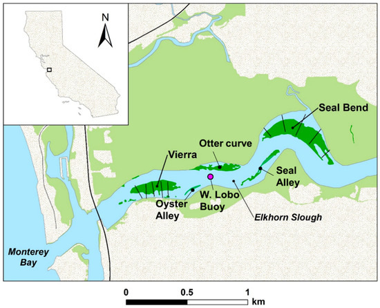 Elkhorn Slough contains a deep, swift-flowing central channel flanked by wider, shallow areas with aggregated sediment and slower tidal flow. This study focuses on an approximately 2 km2 region of Elkhorn Slough, California, in the southwest near the mouth and includes Seal Bend, one of four major curves in the slough (Figure 2). Dense monospecific eelgrass meadows are known to occur along the shoals in the lower main channel around Seal Bend, Otter curve, Seal Alley, and two locations closer to the mouth of the Slough named Oyster Alley and Vierra, which experience higher current flows. Depths in this region were measured from sidescan sonar collected from the Seafloor Mapping Lab, California State University Monterey Bay [39] (Figure 3). At high slack tide, water depths at the Seal Bend, Seal Alley, Otter Curve and Oyster Alley were around 1.5–2 m. Water depth at the Vierra Bed ranged from 2 m nearshore to 4.5 m in the central channel. The upper limit of eelgrass extent is related to the tidal range and the danger of desiccation at the lowest tides [40]. The lower limit of eelgrass is related to water clarity and light limitation at depth. In this region, the slough extends 200 m across, and the main channel reaches depths of 10 m.