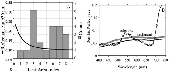 (A) A histogram of the eelgrass Leaf Area Index (LAI) measured along the various transects in Otter Curve and Seal Bend (left axis) with LAI values largely greater than 3 in this region. The solid black line represents the modeled relationship between LAI and Reflectance at 630 nm (right axis) from Hedley et al. (2017) revealing that the signal saturates for dense eelgrass canopies with LAI’s greater than ~3 [11]. (B) Benthic reflectance of sediment measured by divers both within and outside the eelgrass beds (solid lines) compared to eelgrass leaf reflectance measured in the laboratory (dotted line).