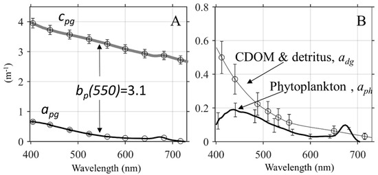 Field measurements near the West LOBO Buoy (Figure 1) made coincident with the overflights of (A) spectral attenuation (cpg), absorption (apg) and particulate scattering (bp). (B) Absorption measurements were partitioned into that by phytoplankton (aph) and colored dissolved and detrital matter (adg) using coincident measurements of ag. The mean over approximately 1 h is shown with one standard deviation as error bars.