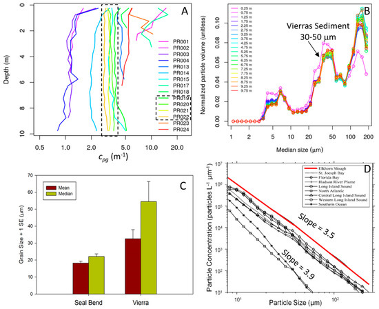 The optical properties in Elkhorn Slough are dominated by highly scattering particulate matter. (A) Measurements of light attenuation by particles and colored dissolved matter (cpg) from the LISST-100X show that the water column was well mixed during the stations coincident with the overflights (black box). (B) The particulate volumetric size distribution from the stations outlined in panel A reveals three predominant particle populations from 5–10 μm, 30–50 μm, and 120–150 μm. (C) The mean sediment particle sizes measured within two eelgrass beds reveals larger particles at the Vierra bed consistent with size of suspended particles measured with the LISST data from Panel B. Adapted from [45]. (D) A global comparison of particle size distributions shows the high amount of particulates and flatter Jungian slope in Elkhorn Slough compared to other sites. Adapted from [24].