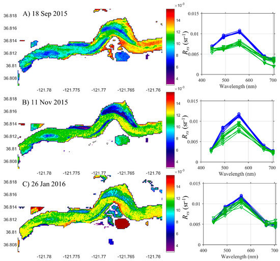 Sentinel-2 images obtained in 2015 and 2016 over Elkhorn Slough reveal darker patches related to the five eelgrass beds. Retrieved remote sensing reflectance at 560 nm can be used to quantify the extent of eelgrass beds based on low reflectance (<0.009) with black contour line provided. For panel C, an additional contour line at 0.01 was added. The right panels show the remote sensing reflectance from over the Vierra seagrass bed (green) compared to sediment seafloor near the W. Lobo buoy (blue) for each image.