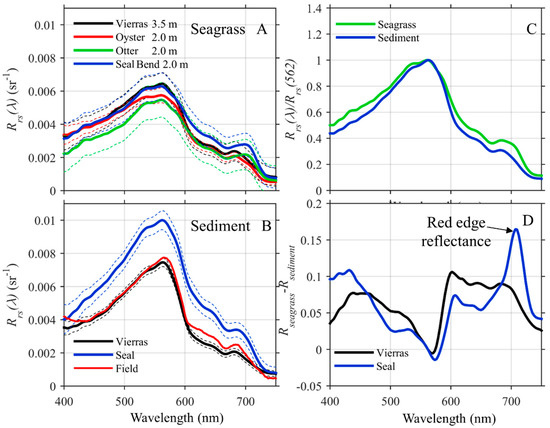 Because water molecules absorb highly in far red and near infrared wavelengths [66], the red edge reflectance of the seagrass can be absorbed by the overflying water column and become less visible at the sea surface with increasing water depth. This is particularly evident in Figure 9D, which shows the difference between Rrs over seagrass and sediment from Vierra and Seal Bend. The red edge is dramatic for pixels overlying the shallow Seal Bend, whereas the red edge is barely evident at the deeper Vierra bed. This means that simple threshold algorithms to identify the presence of submerged aquatic vegetation like eelgrass using a decision tree approach [33,54] will only identify the shallowest seagrass beds, even though spectra may be similar across the blue and green portions of the visible spectrum (Figure 9A).