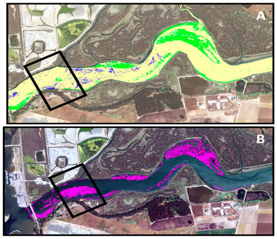 Recent modeling work has shown that the relationship between top of the canopy reflectance of light and LAI decreases exponentially with increasing LAI [4,11]. In other words, the color at the top of the canopy darkens rapidly with initially increases in LAI, but the canopy color “saturates” at some density of LAI (Figure 4A). For canopies with LAI greater than about 3, the canopy reflectance is constant and remote sensing methods cannot be accurately used to quantify LAI without a high level of uncertainty. Given the length of the eelgrass leaves and high LAI, however, we did not attempt to quantify LAI from the imagery and focused only on detecting the presence or absence of dense eelgrass meadows and the extent of the beds in the turbid waters of Elkhorn Slough.