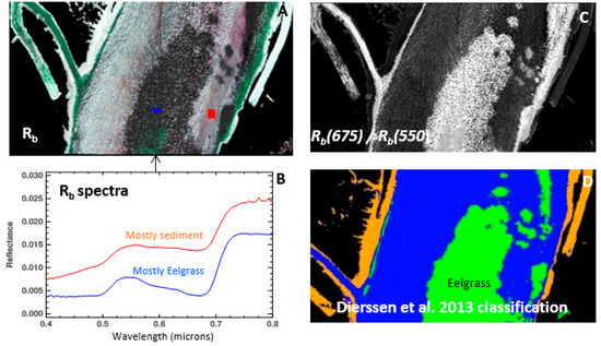 The remote sensing signal obtained over optically shallow water is influenced by the reflectivity of the seafloor and the amount and optical properties of the intervening water column. The sediment in this part of the Slough was dark gray in color ranging from 3% to 7% reflectance across the visible spectrum (Figure 4B). Sediment spectra increased monotonically from 400 to 700 nm and showed only a slight dip at the chlorophyll-a absorption band at ~660 nm indicating low amounts of associated algae or biofilm. Sediment within the bed was 11% darker than sediment outside the bed likely due to enhanced organic detritus and other absorbing matter trapped within the eelgrass meadow. Reflectance from eelgrass leaves was similar to leaf reflectance spectra from turtle grass [3] and other seagrass species from the literature [11,61], peaking in the green wavelengths (550 nm) and containing a sharp increase in reflectance in the far red and infrared portion of the spectrum, the “red edge of reflectance” associated with all pigmented vegetation [62,63]. This near infrared signal is highly absorbed by water molecules and only emerges from the water column when the benthos is very shallow.