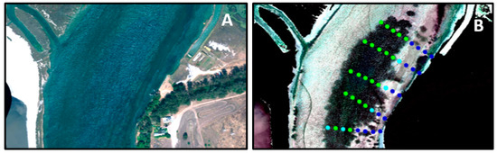 Here, we implemented an algorithm to classify vegetated marine targets using the red edge of submerged and floating vegetation where λ1 = 700 nm and λ2 = 670 such that values greater than 0 were considered vegetated and less than 0 predominantly sand or optically deep [33].