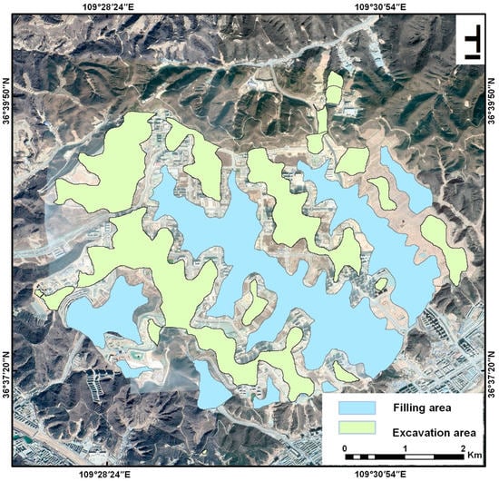 Distribution of valley filling and mountain excavation in Yan’an new district (YND) superimposed on the Google Earth image. The blue and yellow regions represent filling and excavating areas, respectively.