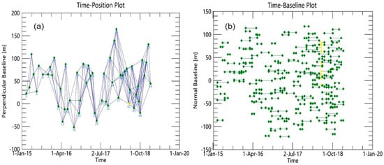 - The first part is the basis of the SBAS-InSAR. By selecting a definite temporal-spatial baseline threshold (time baseline 120 days, space baseline 121 m), the data sets were divided into different subsets and 201 interferometric pairs were generated (Figure 3).