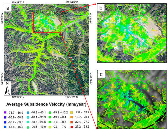 The average velocity of surface deformation in the Yan’an urban area. (a) The urban area of Yan’an superimposed on the Google Earth image. The detailed surface deformation of YND superimposed on (b) the Google Earth image and (c) SRTM data.
