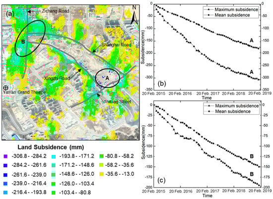 (a) The subsidence zone in YND superimposed on the Google Earth image; (b,c) represent the evolution of land subsidence of regions A and B, respectively.