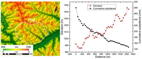 The correlation between elevation variation along the filling region and cumulative subsidence. The elevation is obtained along the red line in the left figure at the direction of southeast towards northwest with an interval of 40 m. The cumulative subsidence is calculated within the region by average. The x-axis of right figure represents the collection interval of the elevation.