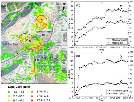 (a) The uplifting area in YND superimposed on the Google Earth image; (b,c) represent the evolution of land uplift of region C and D, respectively.