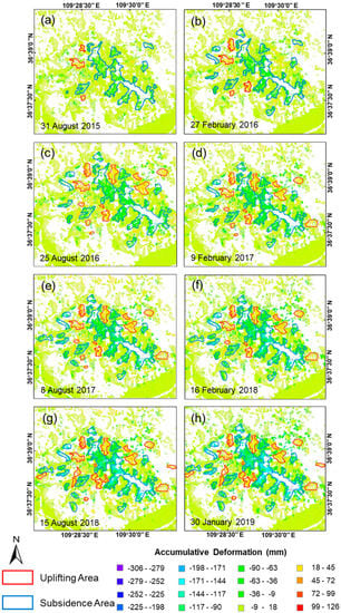 (a–h) Evolution of land deformation in YND from February 2015 to January 2019. Red and blue polygons represent uplift and subsidence areas, respectively. Moreover, the color scale represents the cumulative deformation relative to February 2015.