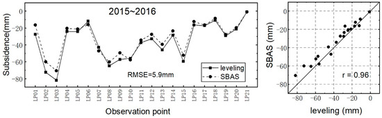 Twenty-one highly precise leveling points in YNA (Figure 10) were used to verify the validity of SBAS-InSAR results. This research compared the results of SBAS and leveling data at these leveling points. It should be noted that leveling results were derived from differences between the last and the first measurement, while SBAS results were extracted from the pixels, including the location of the leveling point. Figure 11 shows a comparison of the two sets from August 2015 to June 2016. Results show that the two data sets have reasonable consistency. Moreover, the RMSE and correlation coefficient value of the two sets are 5.9 mm (7.4 mm/year) and 0.96, respectively. The largest and mean differences between the two sets are 12.4 mm and 3.8 mm, respectively. Although leveling data of subsidence points in YND are absent, the data source and deformation process in YND and YNA are consistent, which indicates that the SBAS-InSAR monitoring in the YND also yielded relatively reliable results.