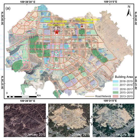 (a) The change of the buildings area and road network from 2013 to 2019. (b–d) Change of landscape in YND based on Google Earth images.