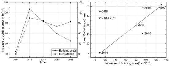 The relationship of the annual increase of building area and land subsidence from 2013 to 2018.