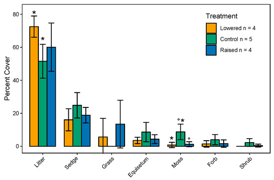 Results of APEX vegetation cover sampling. Bars represent the treatment mean. Error bars represent standard deviation. Percent cover was calculated for each PFT as a fraction of the total number of observations. Data were analyzed for statistical significance using a one-way ANOVA with a post-hoc pairwise means comparison for significant difference among treatments. Bars with the same symbol are significantly different from each other (ANOVA, p < 0.05).