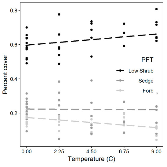 For both sites, we calculated the percent cover of each PFT as a fraction of the total observations made at the plot level. The total number of plots included in our analysis was 13 across the three treatments at APEX, and 33 plots across 13 chambers at SPRUCE. At APEX, the effect of water table treatment on PFT cover was analyzed using a one-way ANOVA with a post-hoc pairwise means comparison to determine whether significant differences existed among treatments. At SPRUCE, we used a linear mixed effects modeling framework to evaluate the response of PFT cover to warming and elevated CO2. Temperature was added to the model as a continuous variable, and CO2 level was included as a factor. We included treatment chamber in the model as a random effect and evaluated model fit using the Akaike information criterion, as well as both marginal and conditional R2, which describe the variance explained by the fixed effects and full model, respectively [69]. Linear mixed effects modeling was done using the lme4 package in R.
