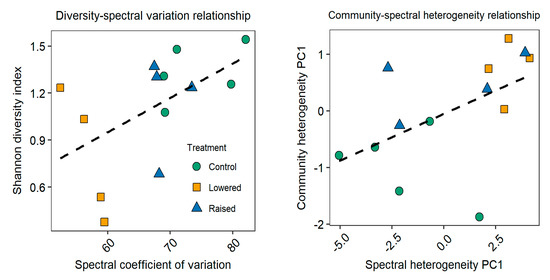 In low-diversity ecosystems such as peatlands, the loss of species diversity may have cascading effects on ecosystem function and productivity [44]. The low functional redundancy of peatlands is such that the loss of a species may also represent the loss of an entire plant type, thereby negatively effecting ecological productivity [47]. We demonstrate that drought in peatlands negatively affects diversity, particularly of mosses and herbaceous species. Specifically, variation and heterogeneity in spectral reflectance increased with increasing Shannon diversity among plots. Increasing spectral heterogeneity has been previously used as a proxy for diversity in studies that have mapped peatland ecological diversity using remote sensing [91,92,93]. This type of study is based on the species–area relationship in which species richness increases with scale across a heterogeneous landscape [94]. These studies have extrapolated species richness by calculating indices such as the normalized difference vegetation index (NDVI), then calculating heterogeneity for pixel aggregates of varying spatial scales [53,55]. Where these approaches have modeled diversity as a function of area, our approach captures diversity directly by comparing the spectral heterogeneity among plots with varying levels of diversity [53]. Alternative approaches have attempted to map diversity through the identification of unique species [54,95,96,97]. However, this approach is challenging in non-forested systems in which individual organisms do not occupy an entire pixel. Our results indicate remote sensing may be used to estimate relative levels of diversity directly by comparing the spectral heterogeneity of measurements performed over a variety of different canopy types. We suggest that these results offer the ability to track diversity in systems with mixed or heterogeneous community assemblages that include trees, shrubs, graminiods, or other plant types [98].