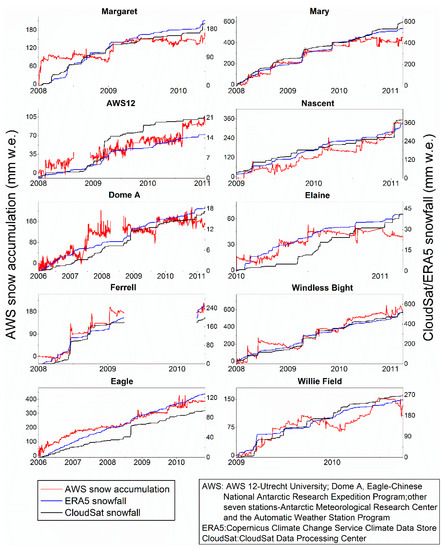 - Boening, C.; Lebsock, M.; Landerer, F.; Stephens, G. Snowfall-driven mass change on the East Antarctic Ice Sheet. Geophys. Res. Lett. 2012, 39. [Google Scholar] [CrossRef]