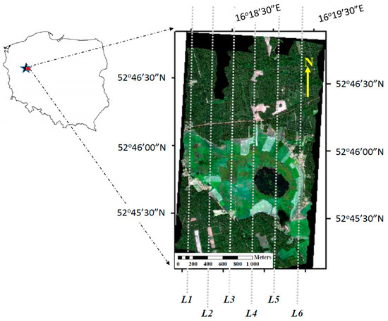 Location of the Rzecin peatland experimental site in the Wielkopolska region, Poland. An RGB composite map was obtained by combining reflectance bands at 156 nm, 105 nm, and 51 nm for the red, green, and blue bands, respectively—including flight lines of the HyPlant over the site during the Spectrometry of a Wetland and Modelling of Photosynthesis (SWAMP) campaign on 11 July 2015.
