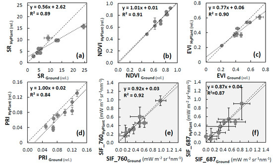 Validation of airborne HyPlant-derived VIs and SIF with ground observations on corresponding plots; (a) SR, (b) NDVI, (c) EVI, (d) PRI, (e) SIF at 760 nm, and (f) SIF at 687 nm. Error bars represent the spatial variability of the index values within the selected plots during HyPlant overpasses. Note: HyPlant SIF values were retrieved from the rescaled data (for details see Section 2.6.