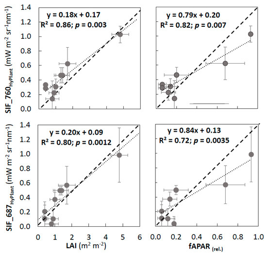 Ground-based measured SIF at the plot-scale (Table 2, Figure 2) was compared with HyPlant measured SIF at both 687 nm and 760 nm. Hyplant-derived SIF and VIs values were calculated as an average of nine pixels (3 × 3) centered around each ground plot. Then, we tested a 1:1 linear regression model between SIF values computed from HyPlant and ground-based data and evaluated the strength of the correlation between SIF values for both chlorophyll fluorescence peaks at 687 nm (R2 = 0.92) and 760 nm (R2 = 0.87). The high correlation provided evidence that HyPlant-derived SIF can be rescaled to obtain more accurate SIF maps in absolute terms. It is important to note that the applied procedure did not change relative SIF spatial patterns across the whole image. This approach also facilitated a needed validation of obtained HyPlant SIF maps.