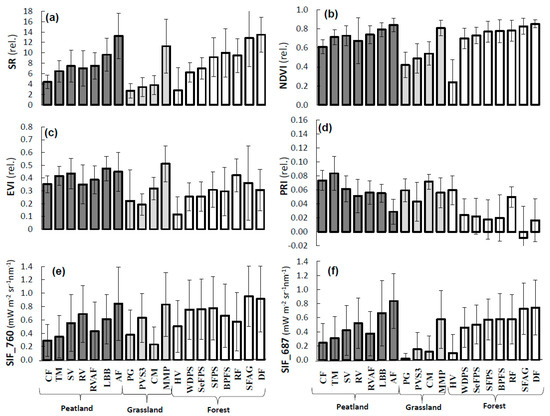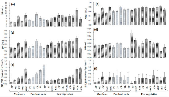 Bar diagram presenting the average values of the observed VIs and SIF derived from HyPlant data; (a) SR, (b) NDVI, (c) EVI, (d) PRI, (e) SIF760, and (f) SIF687. The names of the individual vegetation groups are written at the bottom of the bars and correspond to the abbreviations provided for Figure 3a. The dark grey group of bars represents the peatland ecosystem; light grey bars represent different kinds of grasslands (including the post-agricultural land, pioneer vegetation of sandy and shallow soil); and white grey bars stand for different kinds of forests. Error bars represent standard deviation.