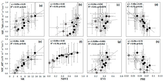 Correlation analysis of SIF at 760 nm (Figure 8a–d) and at 687 nm (Figure 8e–h) with selected remotely sensed VIs (SR, NDVI, and PRI) at the vegetation group level. Error bars represent standard deviation. Here, black dots denote peatland, light grey dots denote grasslands, and white represents forest vegetation groups.